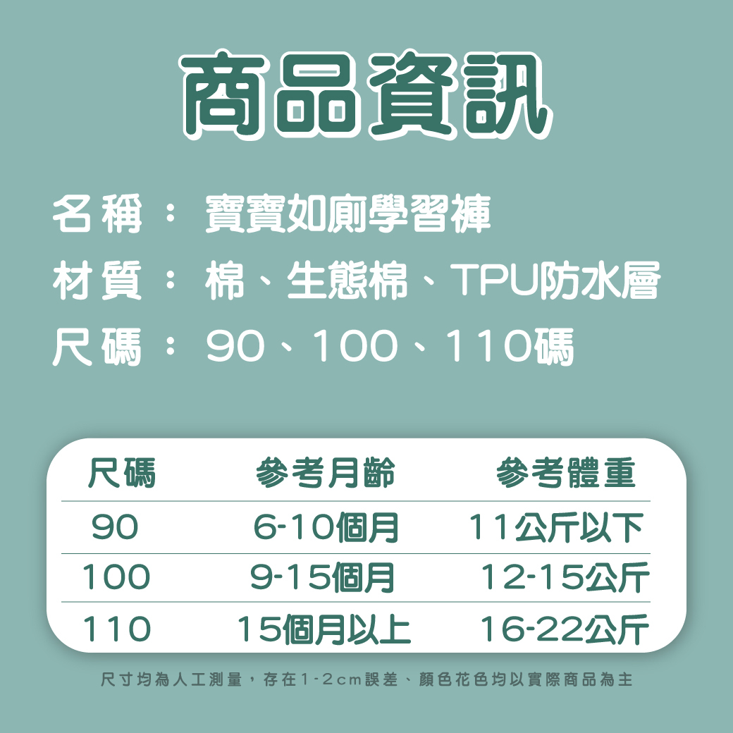 我們提供90、100、110三種尺寸,確保不同年齡和體型的寶寶都能找到合適的學習褲。這些尺寸設計精巧,不會勒腰腿,並配備360度立體環形彈力帶,提供最佳的舒適度。